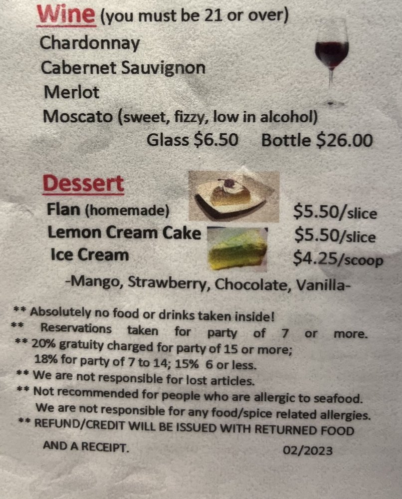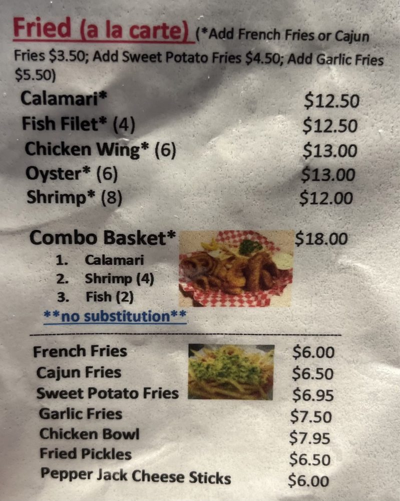 Calamari, shrimp (4), fish filet (2); No Substitution. we only accept same-day orders